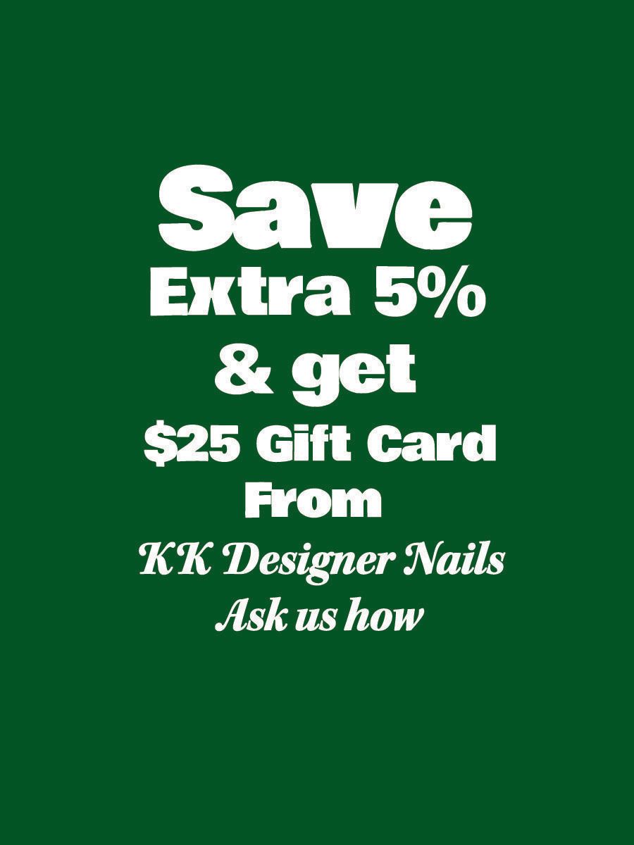Get a $25 Gift Certificate from KK Designer Nails and 5% off are already great prices. Ask your Tax Consultant for details.